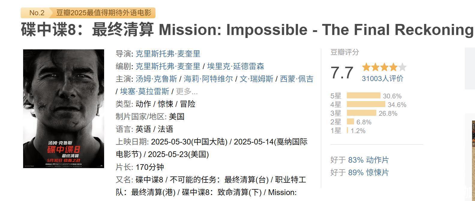 无可否定,豆瓣细目有压着不开分、控评、通过刷好评影响评分的情况,比如还是开播快半个月的《藏海传》依然莫得开分。《碟中谍8》在戛纳首映后,遭到不少差评,但内地上映第二天就开分,讲明片方莫得滋扰,7.7的评分是委果的,而这么的收获,打了总计黑子的脸。