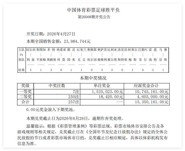 北京技艺4月27日,输赢彩第26068期开奖效果揭晓。14场1等开出7注,单注奖金153万元;14场2等开出250注,单注奖金18420元;任九开出2581注,单注奖金5088元。本期输赢彩销量为23,984,744元,任九投注总和为20,522,828元。